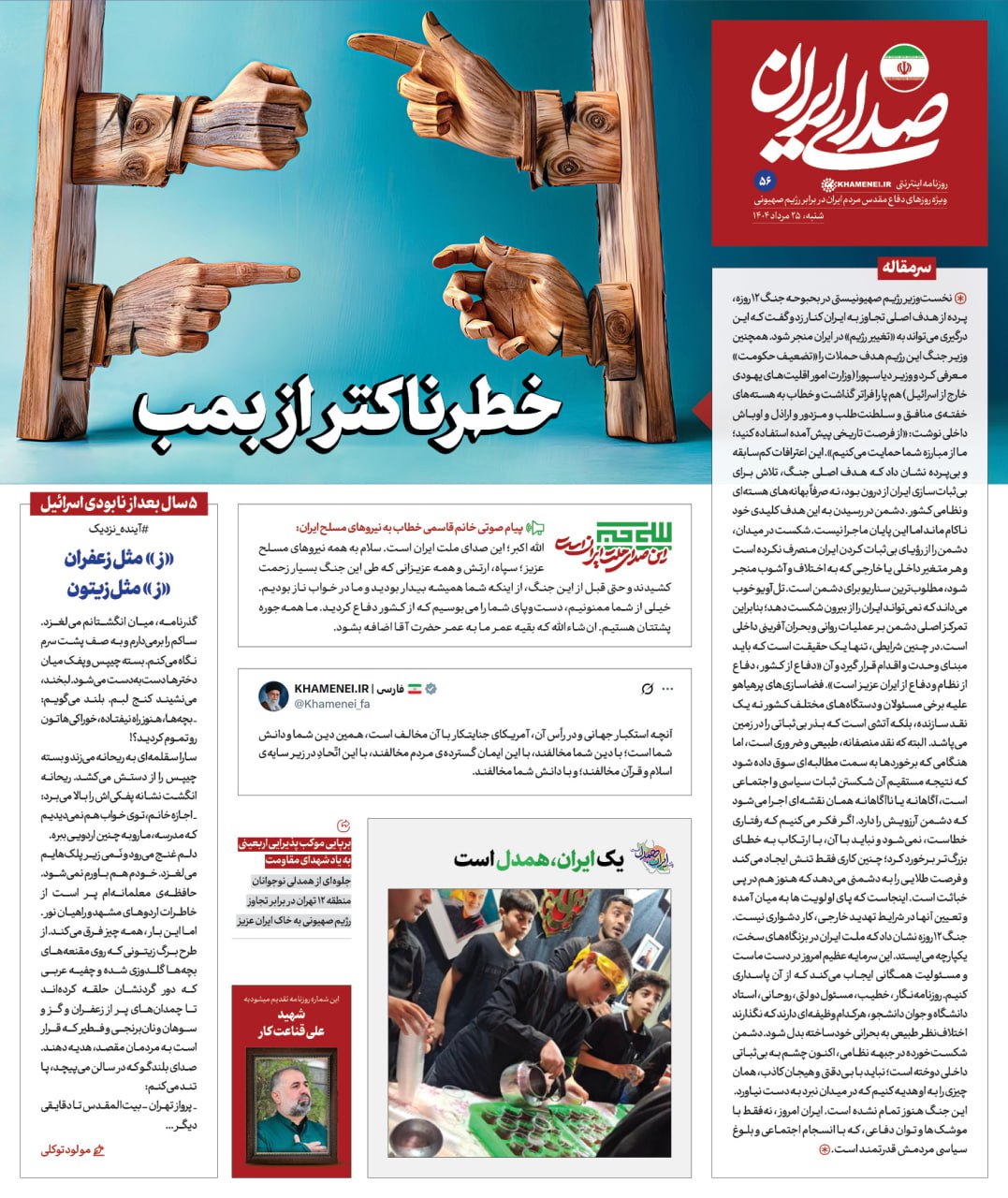 «صدای ایران»، روزنامه اینترنتی رسانهی KHAMENEI.IR که از روزهای آغازین جنگ ۱۲ روزه رژیم صهیونی علیه ایران با مأموریتی که ذکر شد آغاز به کار کرد، حال و در زمان توقف آتش سعی دارد تا بهصورت روزانه همراه ملّت ایران باشد. محورهای مهم و مرتبط را از لابهلای سیل اخبار و اطلاعات درست و نادرست بیرون کشیده، سره را از ناسره جدا کرده و وضعیت راهبردی جمهوری اسلامی ایران را آنگونه که هست روایت کند. «صدای ایران» صدای ملّت ایران خواهد بود و راوی ایستادگی و مقاومت آنها.