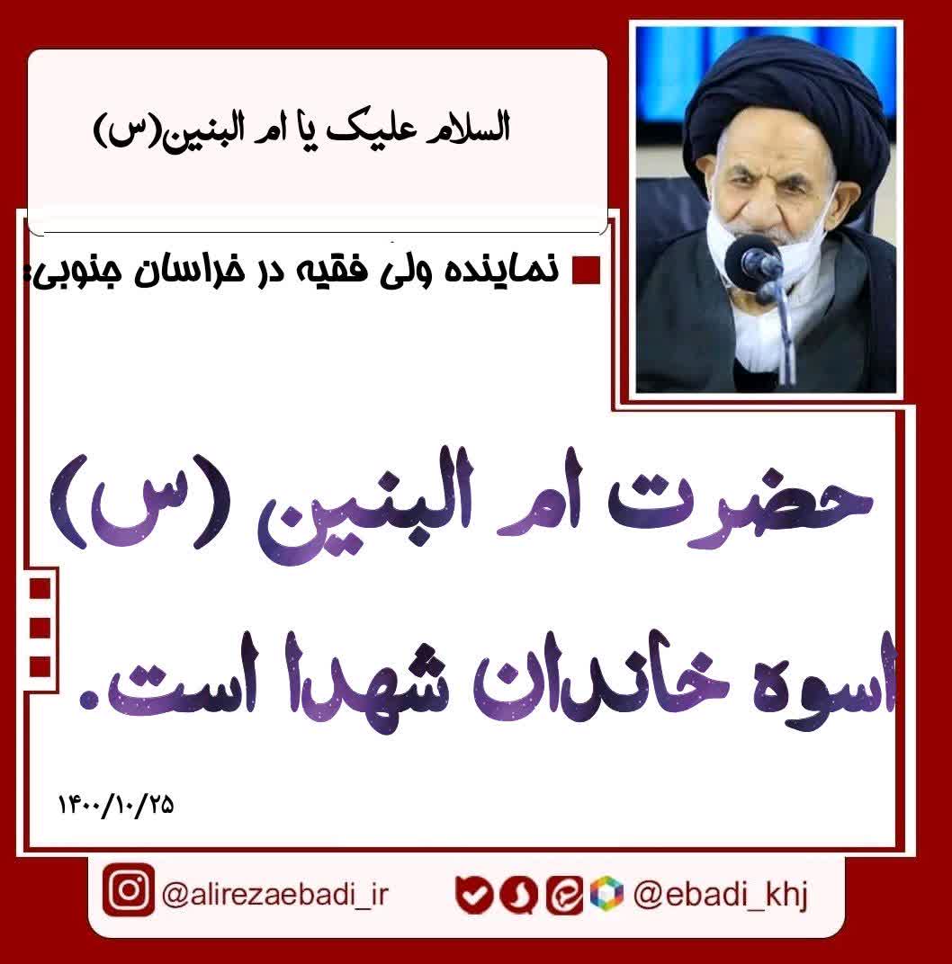 حضرت ام البنین (س) اسوه خاندان شهدا موضوع: مناسبت 1404-09-15 موارد مرتبط: 6 0 ◾نماینده ولی فقیه در خراسان جنوبی: ⚫ حضرت ام البنین (س) اسوه خاندان شهدا است. برچسب ها: